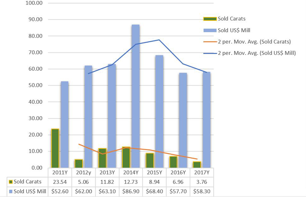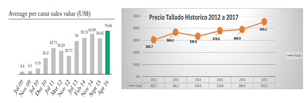 These statistics indicate that the Colombian market keeps growing in terms of per-carat prices, even with a slowdown in production. In Zambia, production is also slowing down, but they have a slightly lower price correction.