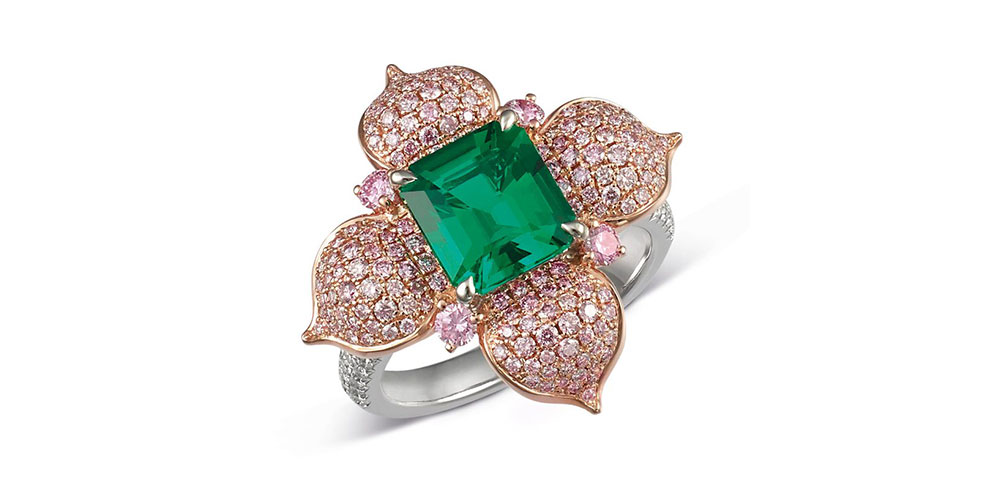 This emerald and diamond and ring represents the premium collaboration between Colombia's Muzo Mine and Rio Tinto's Argyle Diamonds in Australia.